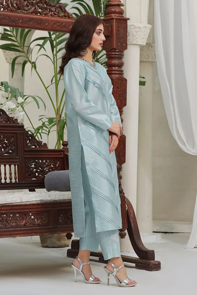 Elegant 2PC stitched silk suit by KHAS in a soothing sky blue shade, crafted from premium silk for a refined, graceful, and timeless festive look.
